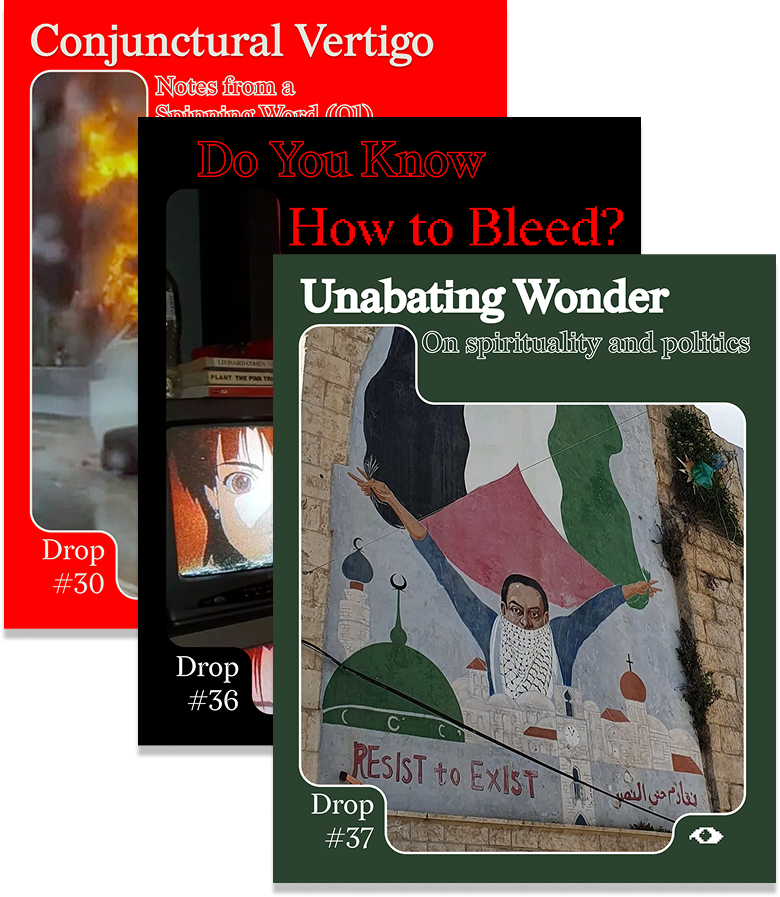 REINCANTAMENTO lavora sia con pubblicazioni digitali che fisiche. Gestiamo DROPS – una pubblicazione online ospitata su Substack che esplora il paesaggio fratturato del contemporaneo. Muovendosi tra tecnologia, cultura, politica e immaginario collettivo, DROPS ospita oltre 35 articoli sia di membri del collettivo che di contributori esterni. DROPS è pubblicato principalmente in inglese, con traduzioni italiane selezionate.