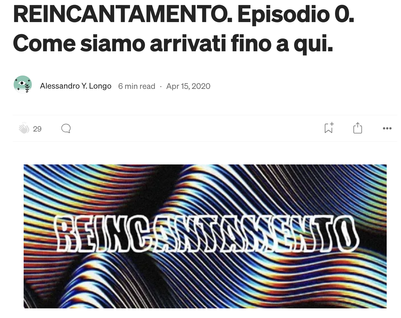 REINCANTAMENTO nasce come una serie di articoli di Alessandro, pubblicati su Medium nell'aprile 2020. Questa prima serie di pezzi esplora gli approcci filosofici alle tecnologie digitali, il problema della sorveglianza, la questione del design e le possibili soluzioni per re-incantare i nostri strumenti. Da questa cruciale cornice filosofica è nata una meditazione online con un'attività quotidiana di divulgazione su Instagram e la pubblicazione di articoli attraverso diversi magazine. In questa fase nasce anche Speculum!, trio filosofico impegnato a ragionare sull’idea di futuro tra Youtube e newsletter.